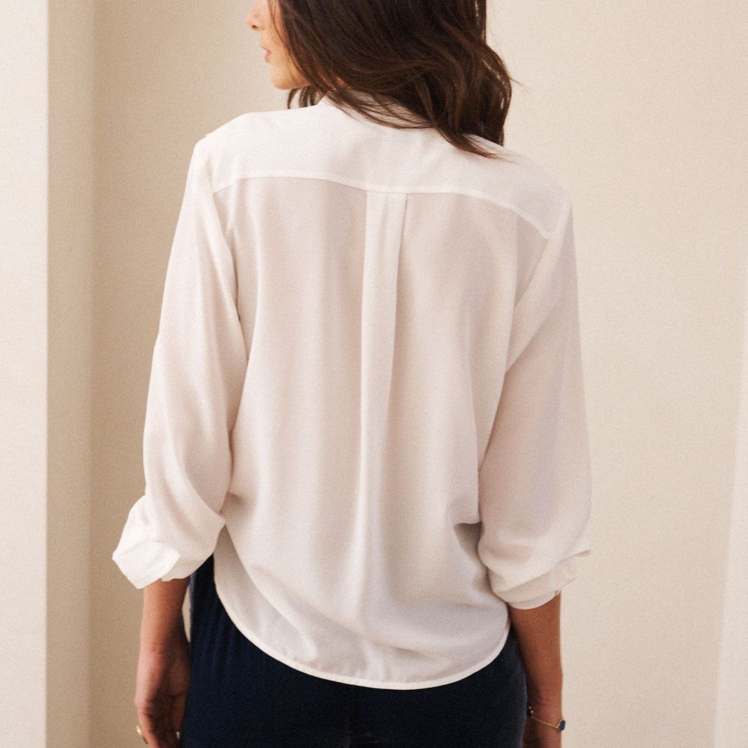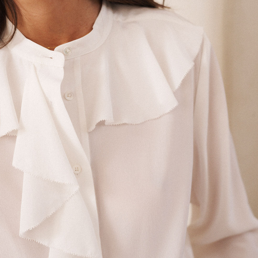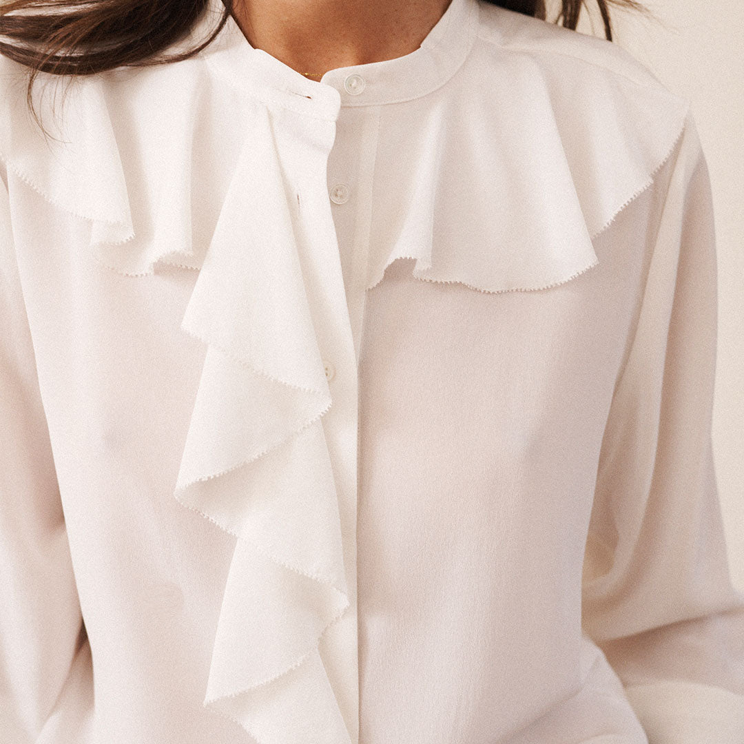 Crafted from 100% silk, the Harri shirt in Ivory combines timeless elegance with everyday wearability. Its delicate frill detailing, button-down front, and neatly buttoned cuffs create a refined silhouette that balances soft romance with versatility. This piece transitions effortlessly from casual to formal settings, making it a sophisticated addition to any wardrobe...