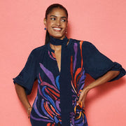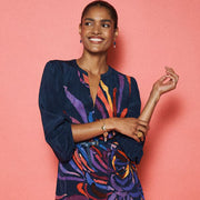 Our latest statement dress... Ines. A new and exclusive firework placement print in a stunning 100% silk silhouette. Where comfort meets chic, the Ines features an airy silhouette and a flattering v-neck and gathered elbow-length sleeves... Striking shades designed to elevate any wardrobe... Your new statement piece this Autumn...