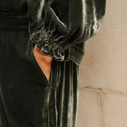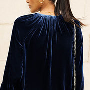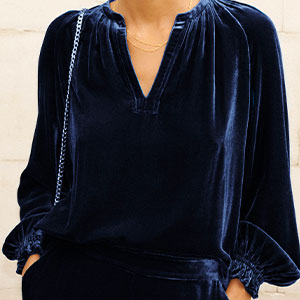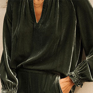A familiar favourite in a new fabric... Nikki is back in our signature silk blend velvet... Your go-to for every autumn event. A romantic, relaxed fit, Nikki features delicate frill detailing at the cuff and a flattering neckline. An easy answer to everyday elegance...