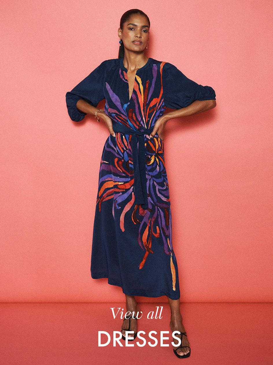 Our latest statement dress...Portia. A new and exclusive tile print in a stunning 100% silk silhouette. Portia offers a sophisticated and stylish look for all your summer events. With short tulip sleeves, a flattering v-neck, and a gathered waist seam... The elasticated back adds ease of fit while the soft shoulder gathers add a touch of femininity...